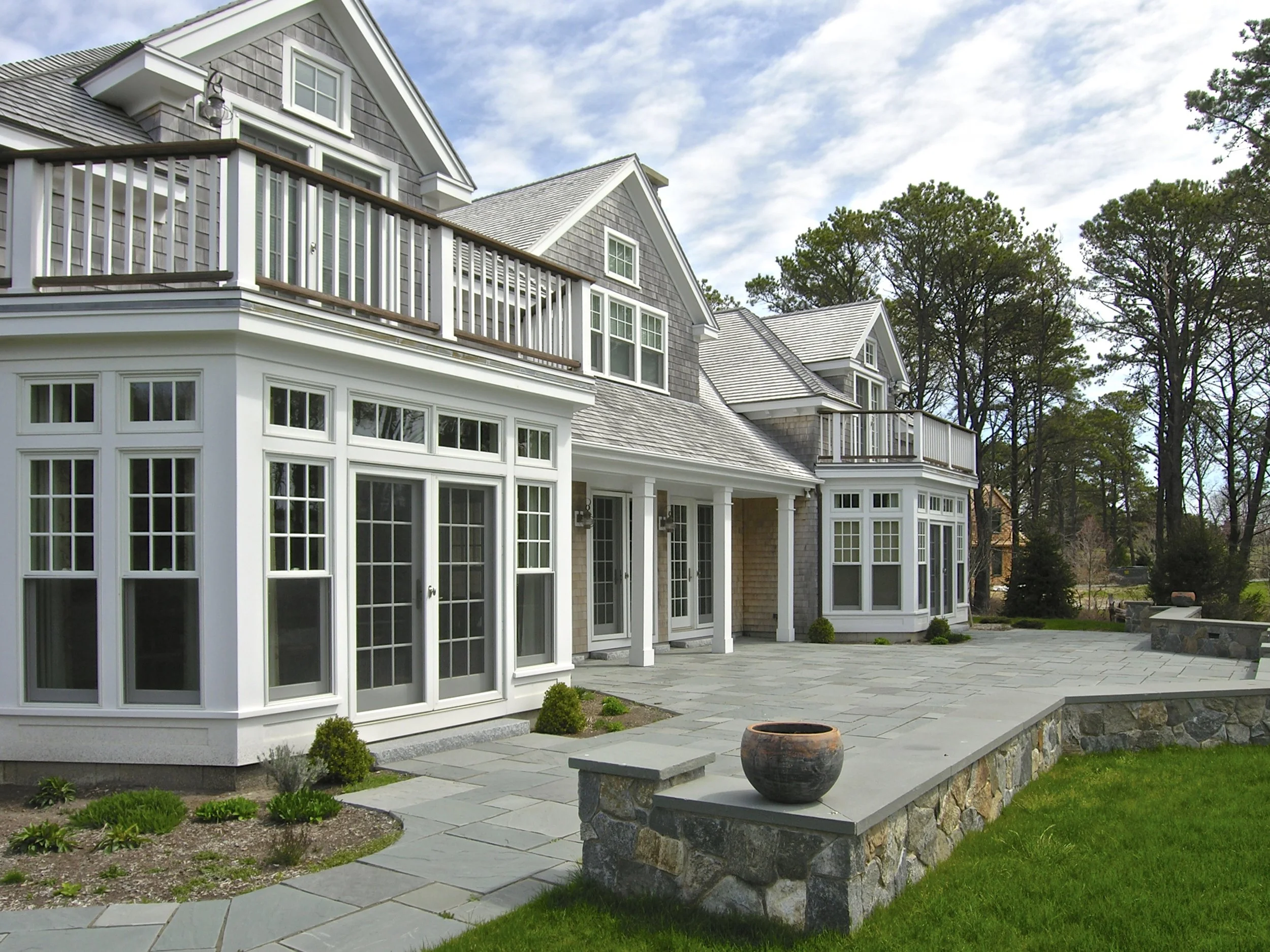 This expansive six-bedroom, six-bathroom shingle-style home overlooks the fifteenth hole of Farm Neck Golf Course on Martha’s Vineyard. The spacious first floor plan boasts a gourmet kitchen, dining room, great room with coffered ceiling and stone fireplace, and a master bedroom wing. Characterized by its clipped main gables and multiple balconies, the second floor connector leads to the stair tower of the two-car garage structure, which houses two guest rooms and a bathroom. Exterior details complement the design, featuring diamond shingled designs and Alaskan yellow cedar roof shakes.