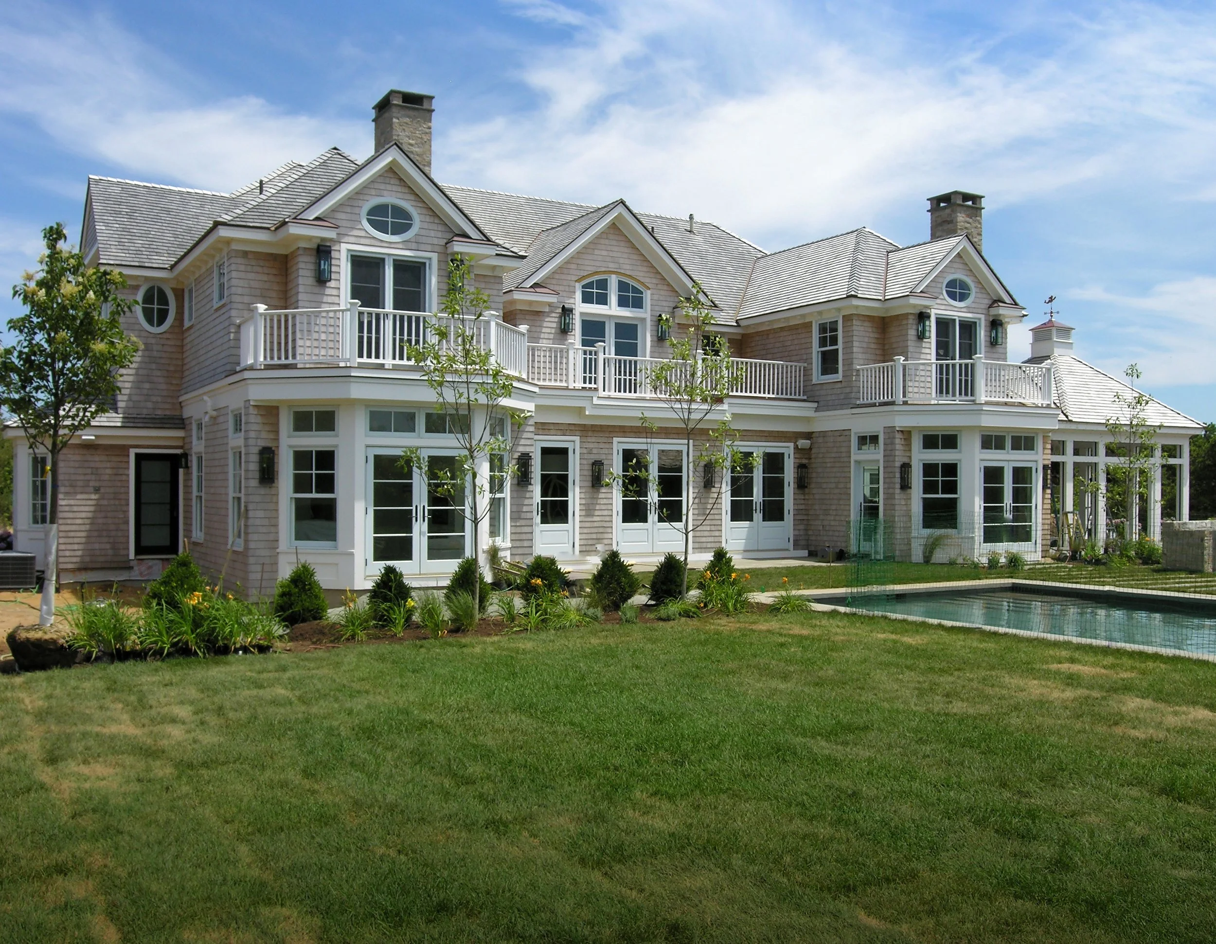 This shingle-style home design features a spacious two-story foyer, accentuated by a large eyebrow window. The symmetrically balanced front facade incorporates a recessed second floor balcony off the second-floor sitting room. A porte-cochere angled connector connects the main house to the dance studio, which is situated over the two-car garage. The proportional exterior massing, along with multiple roof and bracketed eave lines, and unique fish-scale gable details, distinguishes this expansive home from its neighboring properties.
