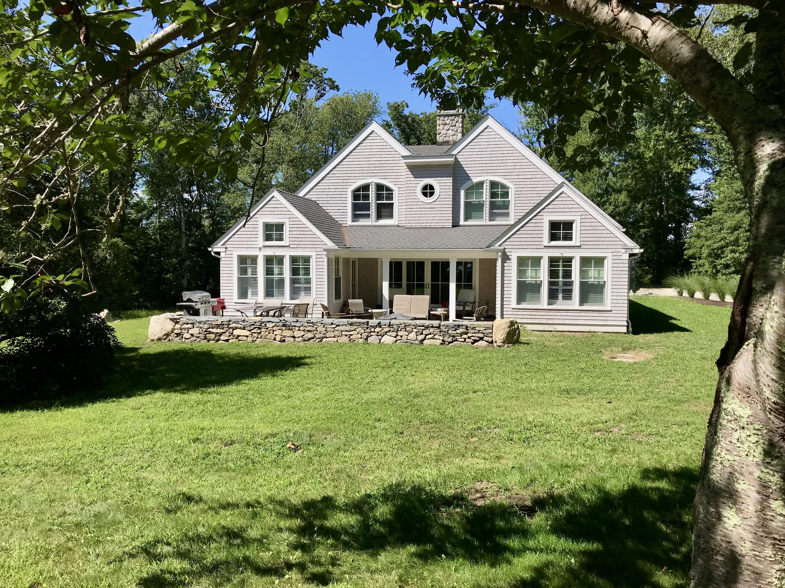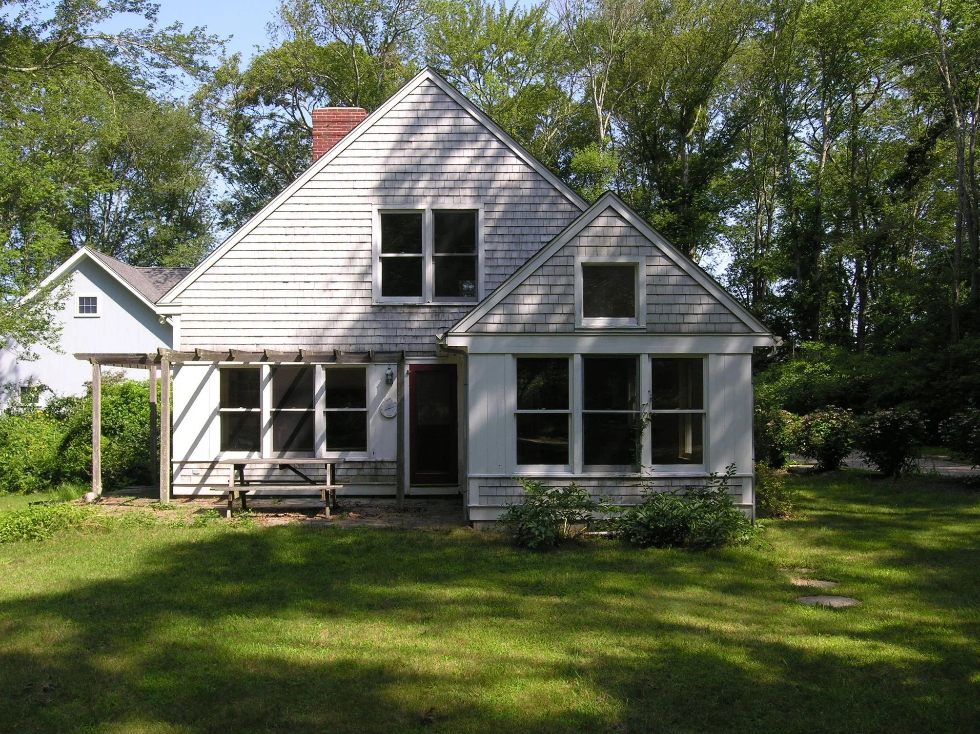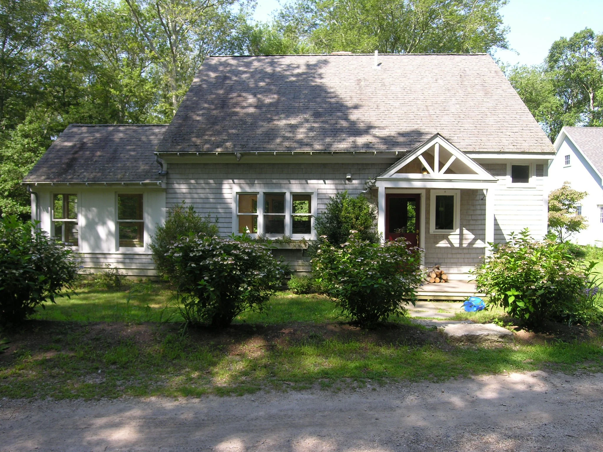 The distinctive design of this residence originated from the existing gable configuration of the 1½-story cape, which was essentially mirrored to create a double gable, thereby expanding its square footage. The entrance was relocated from the roadside elevation to the driveway side of the home, and is enhanced by a covered porch. The newly constructed wing of the home houses the dining room, new kitchen, and ensuite master bathroom. Additional interior renovations were undertaken to accommodate the new entry, provide additional storage, and establish a first-floor laundry facility. On the second floor, a new bedroom and bathroom now harmoniously complement the existing bedroom and loft office.