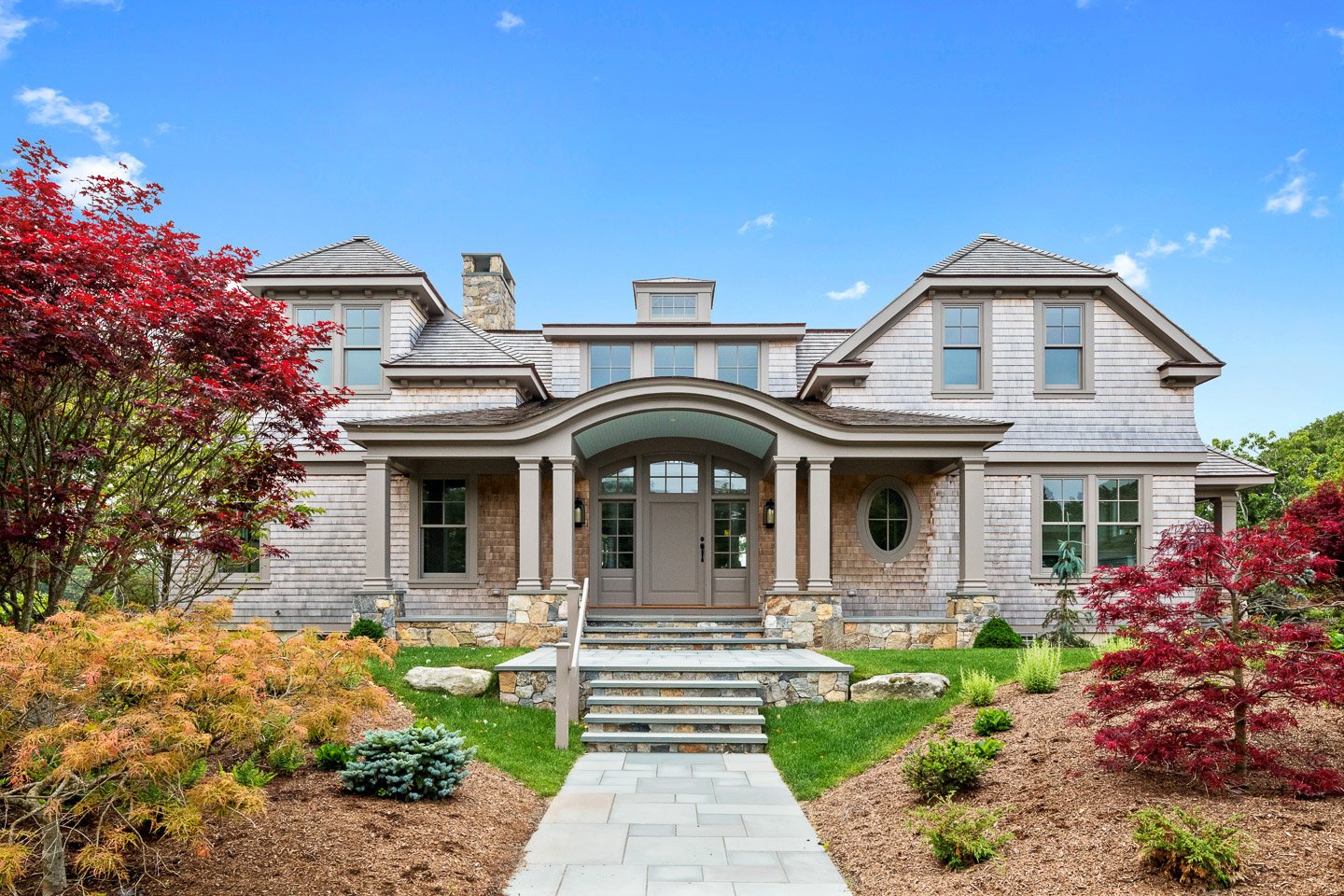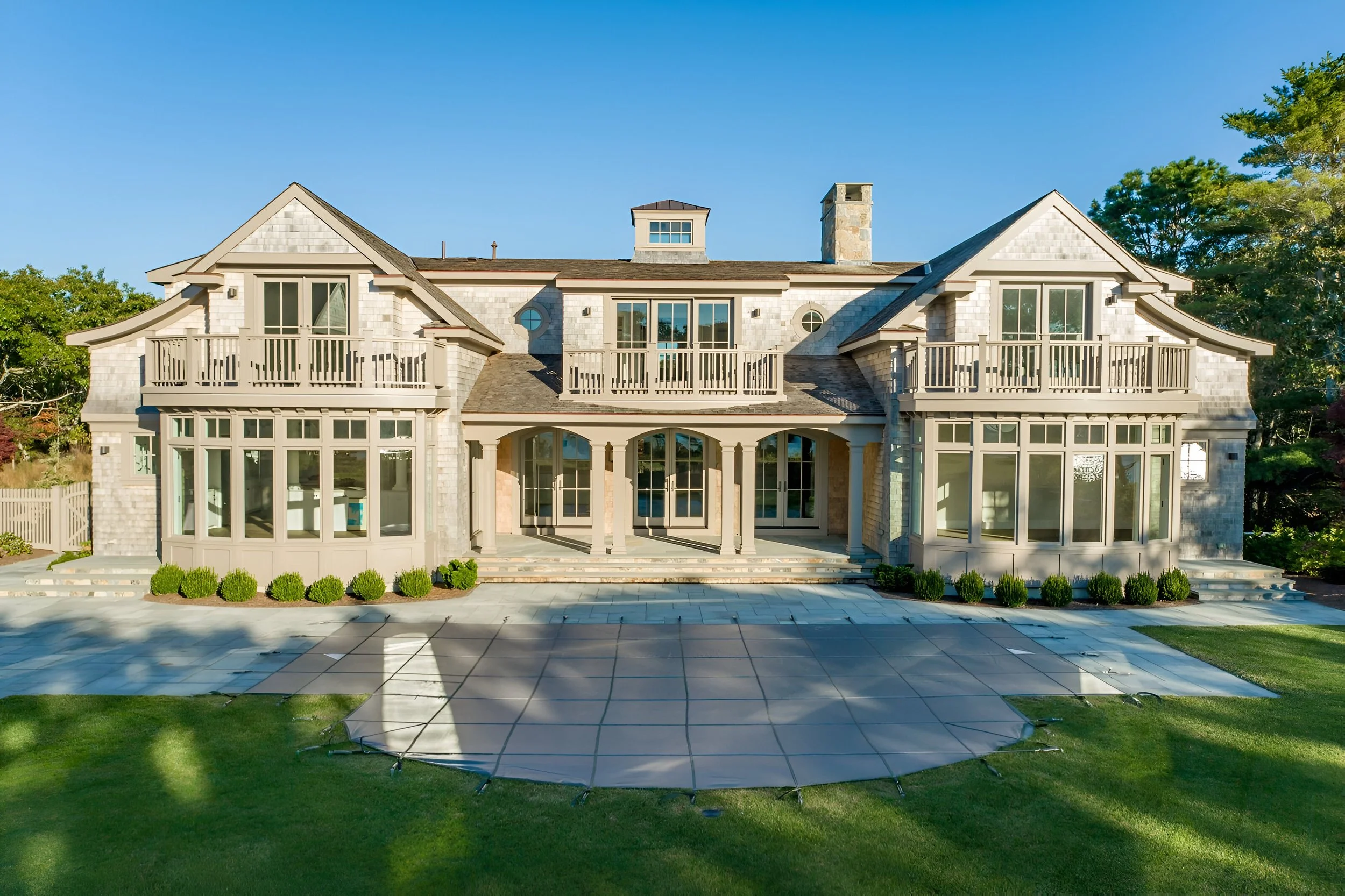 We meticulously designed this shingle-style home exceeding 6,000 square feet to capitalize on the expansive vistas of Great Pond on Martha’s Vineyard. The main residence boasts a spacious and open floor plan, featuring an entry hall, a spacious living room with a fireplace, a gourmet kitchen and eat-in area, all of which are characterized by tall ceilings, 8’ high arched doors and windows that overlook the pool, gardens, and waterviews. The expansive first-floor master bedroom wing is complemented by a large office also accessed from the entry. The second floor, houses three additional ensuite bedrooms along with a secondary master bedroom, all equipped with private balconies with breathtaking views.